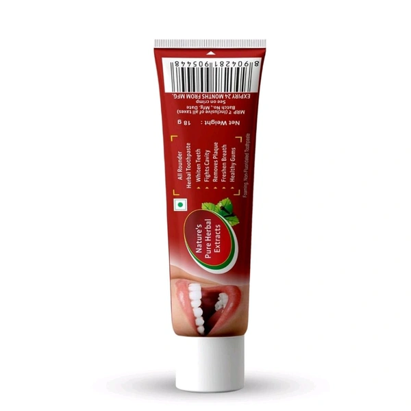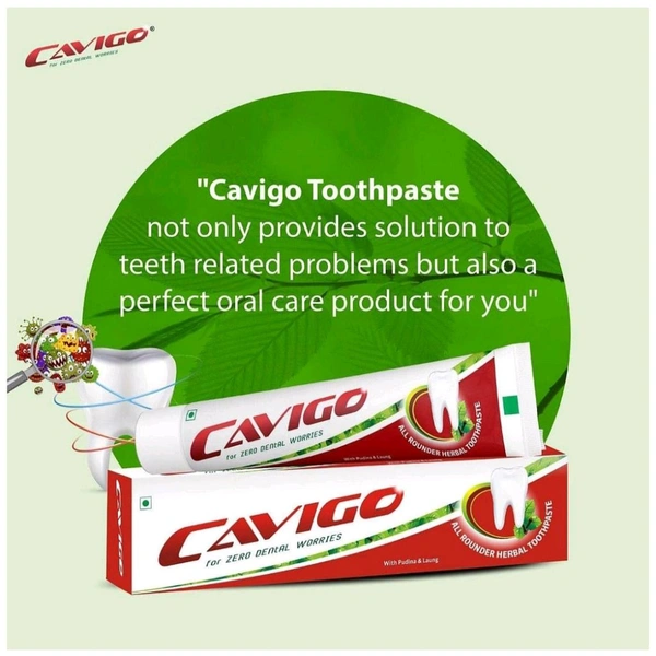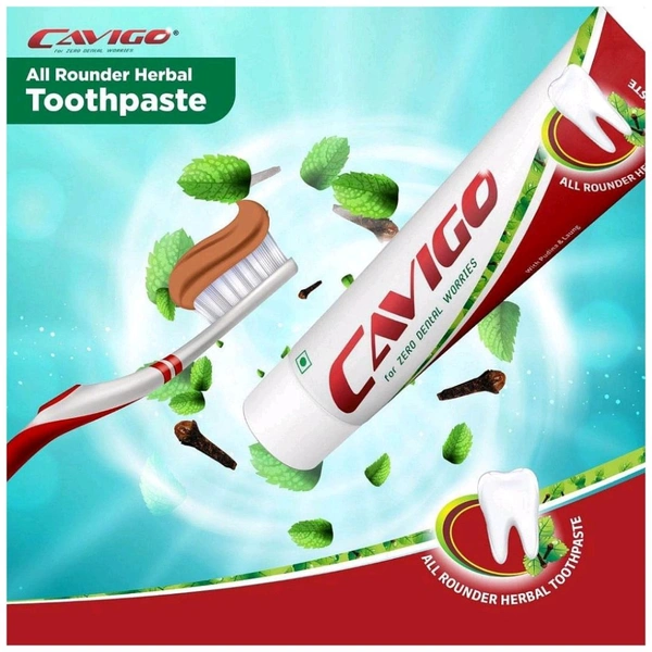 Cavigo All Rounder Herbal Toothpaste is a non-fluoridated, all-in-one oral care solution designed for the entire family. Infused with natural ingredients like Pudina, Lavang, Kapoor, and Cinnamon, it fights cavities, reduces plaque, freshens breath, and strengthens gums. Ideal for sensitive teeth, it promotes healthier gums while ensuring long-lasting freshness and optimal oral hygiene. Perfect for kids, adults, and seniors, Cavigo offers complete protection in one toothpaste
